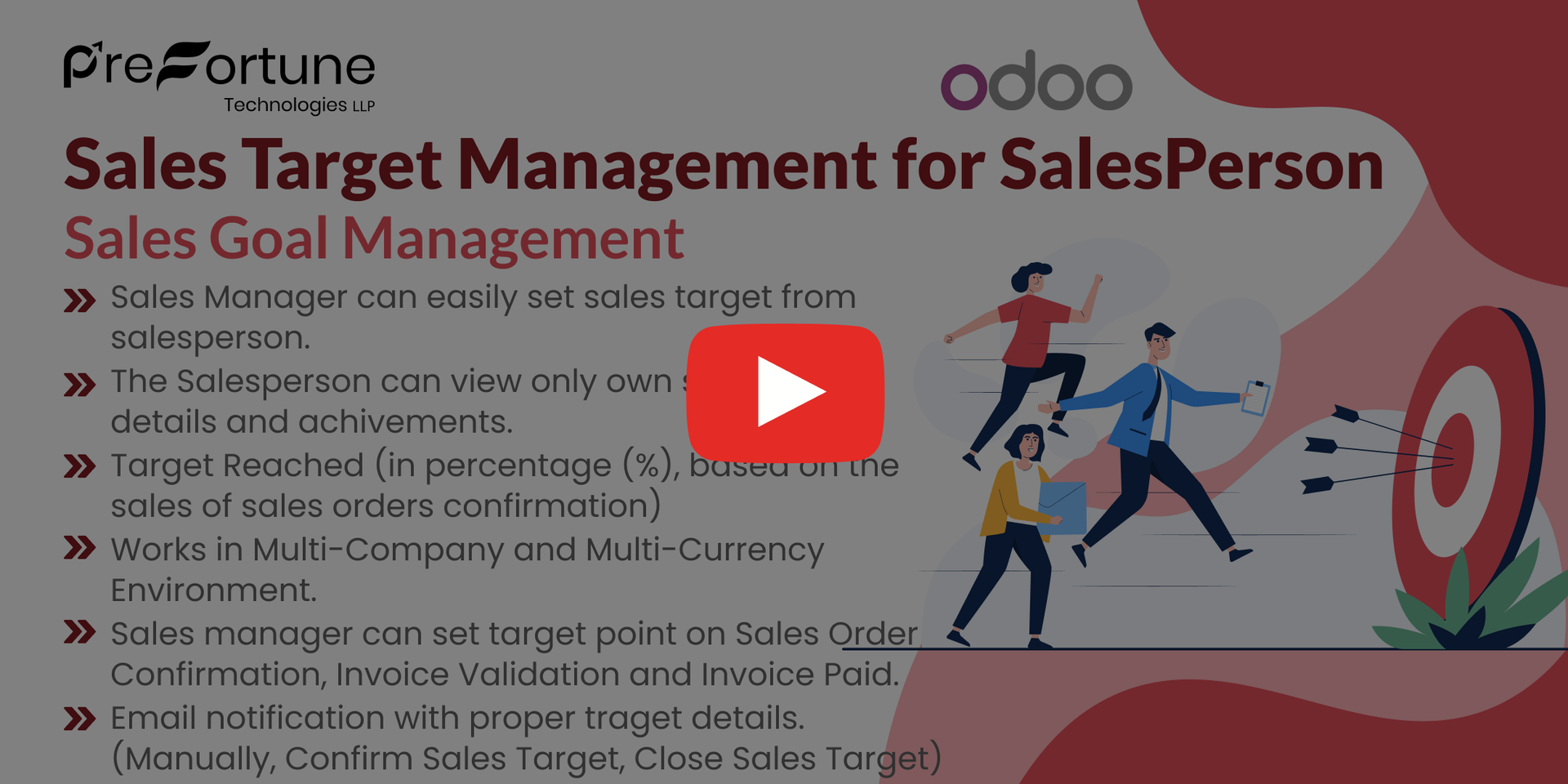 Our all-inclusive Odoo – Sales Target Management for SalesPerson sales Manager can easily set sales target from salesperson .Sales Manager can assign Currency for the Sales Target.The Salesperson can view only own sales target details and achivements.Sales manager can set target point on Sales Order Confirmation, Invoice Validation and Invoice Paid. Sales Total for the period of the sales target.Target Reached (in percentage (%), based on the sales of sales orders confirmation).Invoiced Total during the target period.Target Reached (in percentage (%), based on the invoice validation and invoice paid).Theoretical achivement amount vs Actual achivement amount.Theoretical achivement percentage vs Actual achivement percentage.Email notification with proper traget details.(Manually, Confirm Sales Target, Close Sales Target).Works in Multi-Company and Multi-Currency Environment.